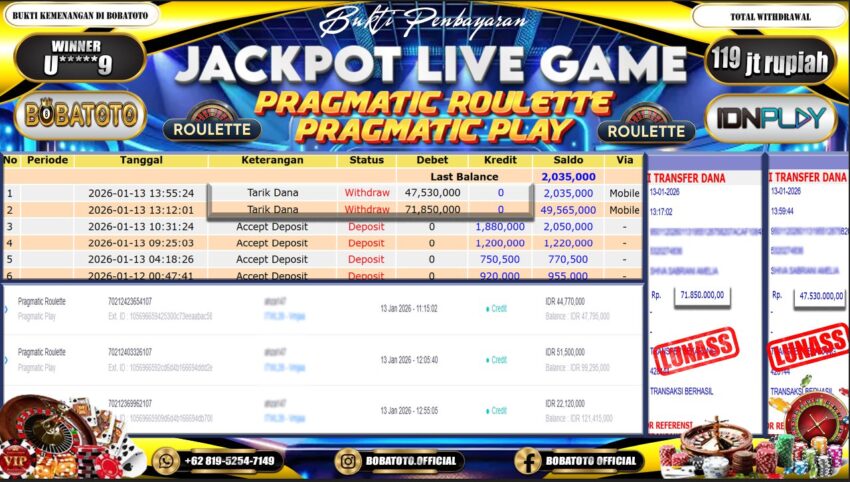 BOBATOTO – Selamat kepada User id : U*****9 Telah berhasil mendapatkan kemenangan besar pada permainan JACKPOT LIVE GAME PRAGMATIC ROULETTE  Dengan kemenangan Sebesar Rp.119,000,000,-. Setelah mengisi formulir withdraw dengan kurung waktu hanya 5 – 10 menit pihak bobatoto sudah melakukan transfer kepada pemilik Userid dan dana sudah dapat di cairkan oleh pemenang. Bukti pembayaran yang kami berikan merupakan bukti pembayaran yang SAH / VALID yang langung di dapatkan melaui tanda transfer transaksi dari Bank yang di tuju.