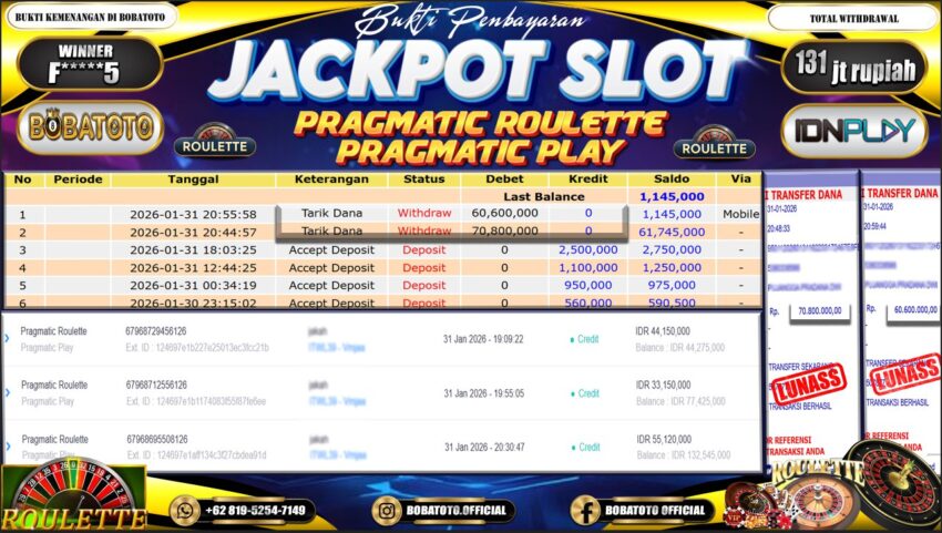 BOBATOTO – Selamat kepada User id : F*****5 Telah berhasil mendapatkan kemenangan besar pada permainan JACKPOT LIVE GAME PRAGMATIC ROULETTE Dengan kemenangan Sebesar Rp.131,000,000,-. Setelah mengisi formulir withdraw dengan kurung waktu hanya 5 – 10 menit pihak bobatoto sudah melakukan transfer kepada pemilik Userid dan dana sudah dapat di cairkan oleh pemenang. Bukti pembayaran yang kami berikan merupakan bukti pembayaran yang SAH / VALID yang langung di dapatkan melaui tanda transfer transaksi dari Bank yang di tuju.