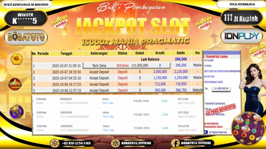 BOBATOTO – Selamat kepada User id : K*****5 Telah berhasil mendapatkan kemenangan besar pada permainan SLOT 15000X MANIA Dengan kemenangan Sebesar Rp.111,000,000,-. Setelah mengisi formulir withdraw dengan kurung waktu hanya 5 – 10 menit pihak bobatoto sudah melakukan transfer kepada pemilik Userid dan dana sudah dapat di cairkan oleh pemenang. Bukti pembayaran yang kami berikan merupakan bukti pembayaran yang SAH / VALID yang langung di dapatkan melaui tanda transfer transaksi dari Bank yang di tuju.