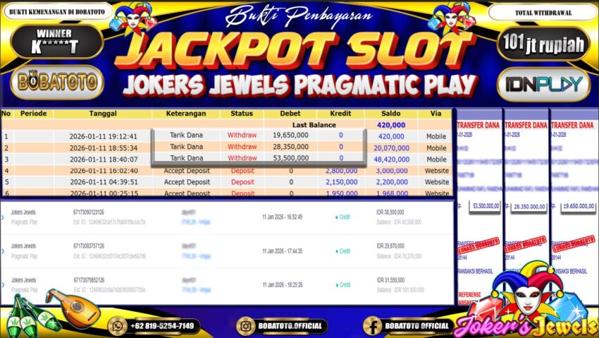 BOBATOTO – Selamat kepada User id : K*****T Telah berhasil mendapatkan kemenangan besar pada permainan SLOT JOKERS JEWELS Dengan kemenangan Sebesar Rp.101,000,000,-. Setelah mengisi formulir withdraw dengan kurung waktu hanya 5 – 10 menit pihak bobatoto sudah melakukan transfer kepada pemilik Userid dan dana sudah dapat di cairkan oleh pemenang. Bukti pembayaran yang kami berikan merupakan bukti pembayaran yang SAH / VALID yang langung di dapatkan melaui tanda transfer transaksi dari Bank yang di tuju.