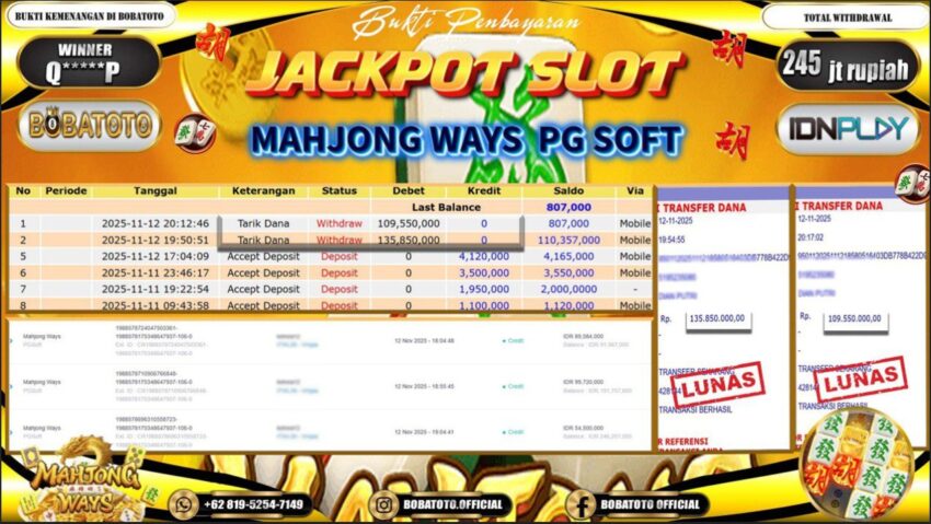 BOBATOTO – Selamat kepada User id : Q*****P Telah berhasil mendapatkan kemenangan besar pada permainan  SLOT MAHJONG WAYS  Dengan kemenangan Sebesar Rp.245,000,000-. Setelah mengisi formulir withdraw dengan kurung waktu hanya 5 – 10 menit pihak bobatoto sudah melakukan transfer kepada pemilik Userid dan dana sudah dapat di cairkan oleh pemenang. Bukti pembayaran yang kami berikan merupakan bukti pembayaran yang SAH / VALID yang langung di dapatkan melaui tanda transfer transaksi dari Bank yang di tuju.