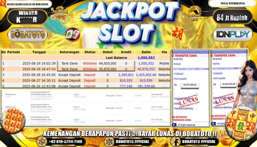 BOBATOTO – Selamat kepada User id :K*****R Telah berhasil mendapatkan kemenangan besar pada permainan SLOT MAHJONG WAYS Dengan kemenangan Sebesar Rp.84,000,000-. Setelah mengisi formulir withdraw dengan kurung waktu hanya 5 – 10 menit pihak bobatoto sudah melakukan transfer kepada pemilik Userid dan dana sudah dapat di cairkan oleh pemenang. Bukti pembayaran yang kami berikan merupakan bukti pembayaran yang SAH / VALID yang langung di dapatkan melaui tanda transfer transaksi dari Bank yang di tuju.