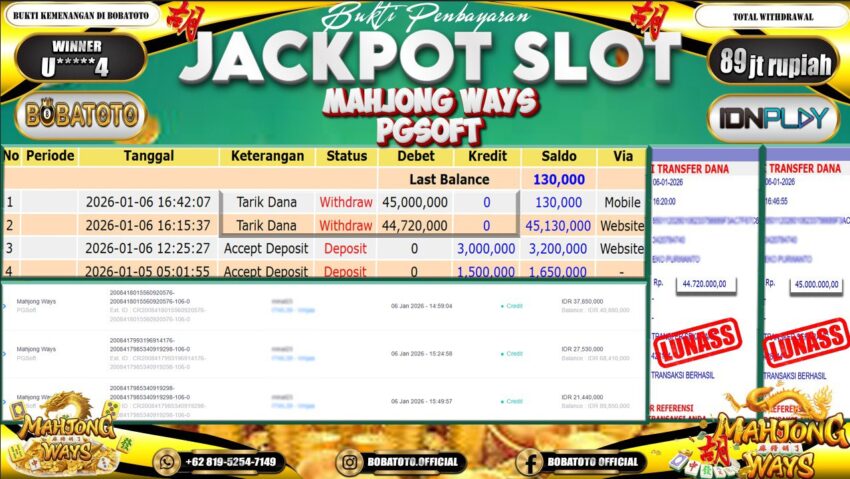 BOBATOTO – Selamat kepada User id :U****4 Telah berhasil mendapatkan kemenangan besar pada permainan SLOT MAHJONG WAYS Dengan kemenangan Sebesar Rp.89,000,000-. Setelah mengisi formulir withdraw dengan kurung waktu hanya 5 – 10 menit pihak bobatoto sudah melakukan transfer kepada pemilik Userid dan dana sudah dapat di cairkan oleh pemenang. Bukti pembayaran yang kami berikan merupakan bukti pembayaran yang SAH / VALID yang langung di dapatkan melaui tanda transfer transaksi dari Bank yang di tuju.
