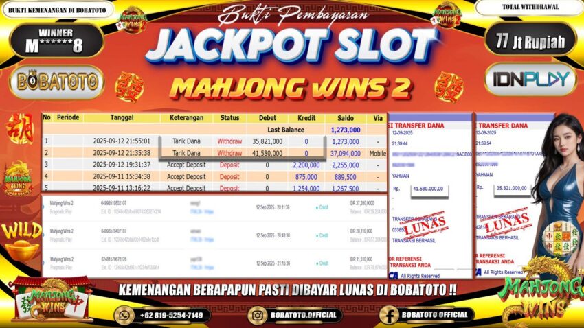 BOBATOTO – Selamat kepada User id :M******8 Telah berhasil mendapatkan kemenangan besar pada permainan SLOT MAHJONG WINS-2 Dengan kemenangan Sebesar Rp.77,000,000-. Setelah mengisi formulir withdraw dengan kurung waktu hanya 5 – 10 menit pihak bobatoto sudah melakukan transfer kepada pemilik Userid dan dana sudah dapat di cairkan oleh pemenang. Bukti pembayaran yang kami berikan merupakan bukti pembayaran yang SAH / VALID yang langung di dapatkan melaui tanda transfer transaksi dari Bank yang di tuju.