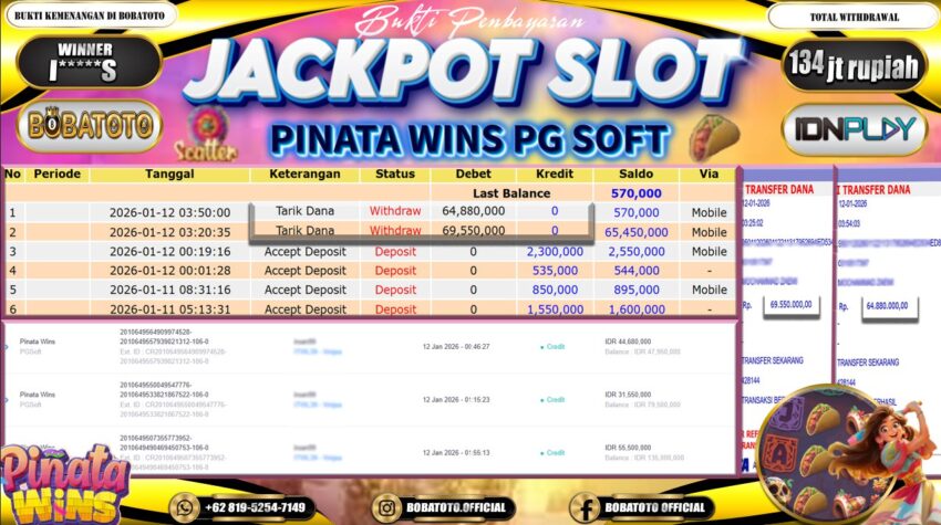 BOBATOTO – Selamat kepada User id :I*****5 Telah berhasil mendapatkan kemenangan besar pada permainan  SLOT PINATA WINS PG SOFT  Dengan kemenangan Sebesar Rp.134,000,000-. Setelah mengisi formulir withdraw dengan kurung waktu hanya 5 – 10 menit pihak bobatoto sudah melakukan transfer kepada pemilik Userid dan dana sudah dapat di cairkan oleh pemenang. Bukti pembayaran yang kami berikan merupakan bukti pembayaran yang SAH / VALID yang langung di dapatkan melaui tanda transfer transaksi dari Bank yang di tuju.