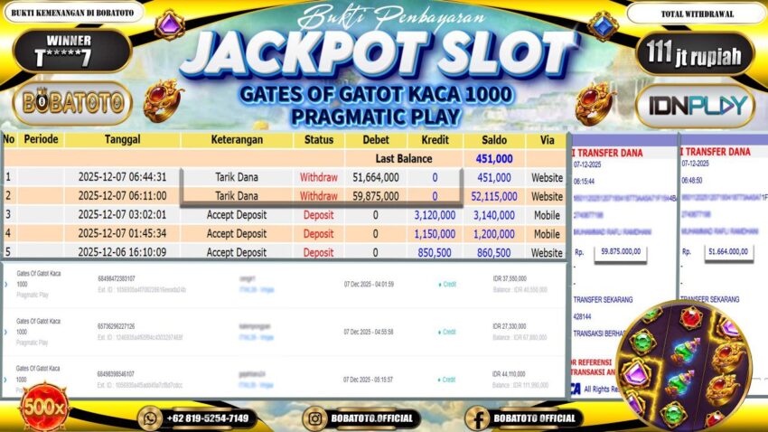 BOBATOTO – Selamat kepada User id : T*****7 Telah berhasil mendapatkan kemenangan besar pada permainan  SLOT PRAGMATIC GATES OF GATOT KACA 1000  Dengan kemenangan Sebesar Rp.111,000,000,-. Setelah mengisi formulir withdraw dengan kurung waktu hanya 5 – 10 menit pihak bobatoto sudah melakukan transfer kepada pemilik Userid dan dana sudah dapat di cairkan oleh pemenang. Bukti pembayaran yang kami berikan merupakan bukti pembayaran yang SAH / VALID yang langung di dapatkan melaui tanda transfer transaksi dari Bank yang di tuju.