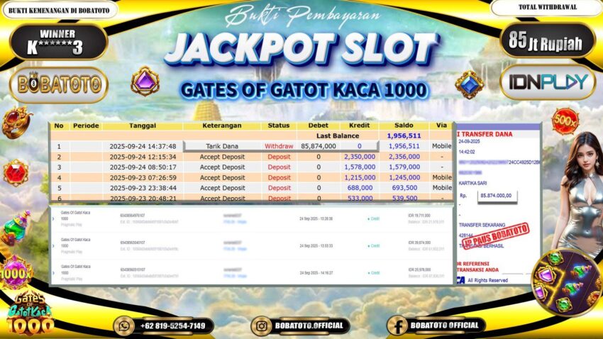 BOBATOTO – Selamat kepada User id : K******3 Telah berhasil mendapatkan kemenangan besar pada permainan SLOT PRAGMATIC GATES OF GATOT KACA 1000 Dengan kemenangan Sebesar Rp.85,000,000,-. Setelah mengisi formulir withdraw dengan kurung waktu hanya 5 – 10 menit pihak bobatoto sudah melakukan transfer kepada pemilik Userid dan dana sudah dapat di cairkan oleh pemenang. Bukti pembayaran yang kami berikan merupakan bukti pembayaran yang SAH / VALID yang langung di dapatkan melaui tanda transfer transaksi dari Bank yang di tuju.