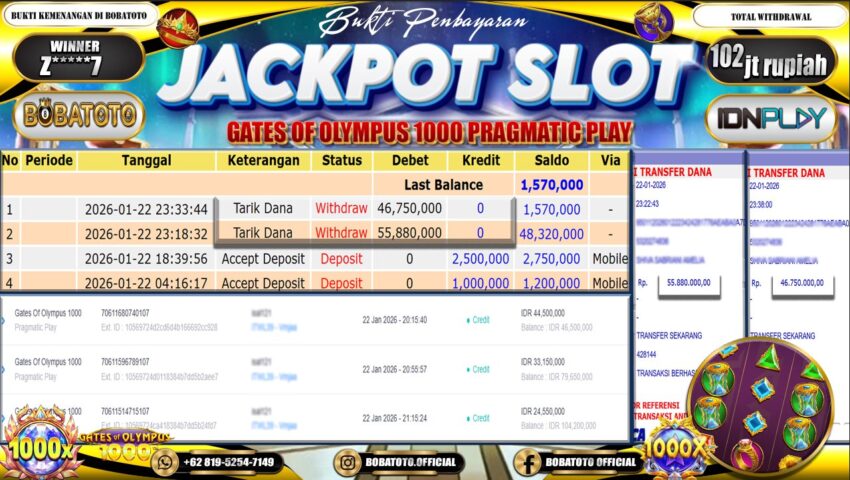 BOBATOTO – Selamat kepada User id : Z*****7 Telah berhasil mendapatkan kemenangan besar pada permainan SLOT PRAGMATIC GATES OF OLYMPUS 1000 Dengan kemenangan Sebesar Rp.102,000,000,-. Setelah mengisi formulir withdraw dengan kurung waktu hanya 5 – 10 menit pihak bobatoto sudah melakukan transfer kepada pemilik Userid dan dana sudah dapat di cairkan oleh pemenang. Bukti pembayaran yang kami berikan merupakan bukti pembayaran yang SAH / VALID yang langung di dapatkan melaui tanda transfer transaksi dari Bank yang di tuju.