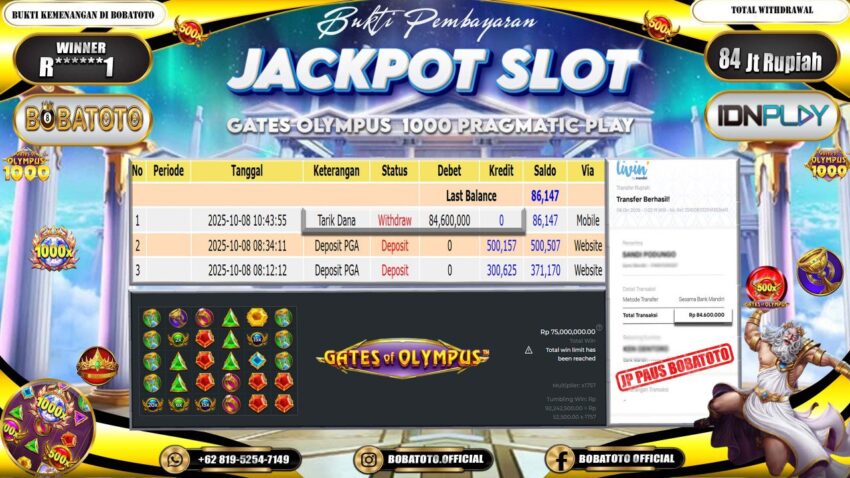 BOBATOTO – Selamat kepada User id : R******1 Telah berhasil mendapatkan kemenangan besar pada permainan SLOT PRAGMATIC GATES OF OLYMPUS 1000 Dengan kemenangan Sebesar Rp.84,000,000,-. Setelah mengisi formulir withdraw dengan kurung waktu hanya 5 – 10 menit pihak bobatoto sudah melakukan transfer kepada pemilik Userid dan dana sudah dapat di cairkan oleh pemenang. Bukti pembayaran yang kami berikan merupakan bukti pembayaran yang SAH / VALID yang langung di dapatkan melaui tanda transfer transaksi dari Bank yang di tuju.