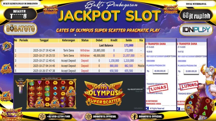BOBATOTO – Selamat kepada User id : T*****8 Telah berhasil mendapatkan kemenangan besar pada permainan  SLOT PRAGMATIC GATES OF OLYMPUS SUPER SCATTER  Dengan kemenangan Sebesar Rp.68,000,000,-. Setelah mengisi formulir withdraw dengan kurung waktu hanya 5 – 10 menit pihak bobatoto sudah melakukan transfer kepada pemilik Userid dan dana sudah dapat di cairkan oleh pemenang. Bukti pembayaran yang kami berikan merupakan bukti pembayaran yang SAH / VALID yang langung di dapatkan melaui tanda transfer transaksi dari Bank yang di tuju.