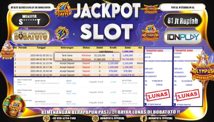 BOBATOTO JACKPOT SLOT PRAGMATIC GATES OF OLYMPUS SUPER SCATTER Rp.81,000,000,- LUNAS!!