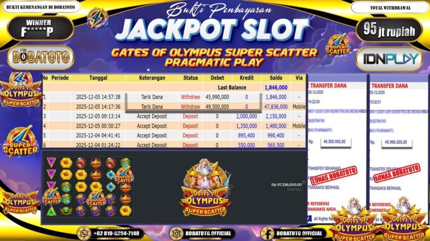 BOBATOTO – Selamat kepada User id : F*****P Telah berhasil mendapatkan kemenangan besar pada permainan SLOT PRAGMATIC GATES OF OLYMPUS SUPER SCATTER Dengan kemenangan Sebesar Rp.95,000,000,-. Setelah mengisi formulir withdraw dengan kurung waktu hanya 5 – 10 menit pihak bobatoto sudah melakukan transfer kepada pemilik Userid dan dana sudah dapat di cairkan oleh pemenang. Bukti pembayaran yang kami berikan merupakan bukti pembayaran yang SAH / VALID yang langung di dapatkan melaui tanda transfer transaksi dari Bank yang di tuju.