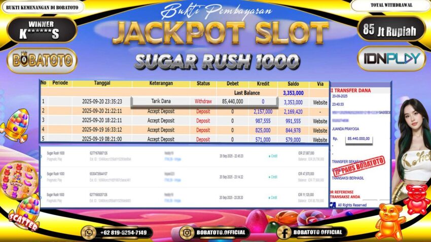 BOBATOTO – Selamat kepada User id : K*****S Telah berhasil mendapatkan kemenangan besar pada permainan SLOT PRAGMATIC SUGAR RUSH 1000 Dengan kemenangan Sebesar Rp.85,000,000,-. Setelah mengisi formulir withdraw dengan kurung waktu hanya 5 – 10 menit pihak bobatoto sudah melakukan transfer kepada pemilik Userid dan dana sudah dapat di cairkan oleh pemenang. Bukti pembayaran yang kami berikan merupakan bukti pembayaran yang SAH / VALID yang langung di dapatkan melaui tanda transfer transaksi dari Bank yang di tuju.