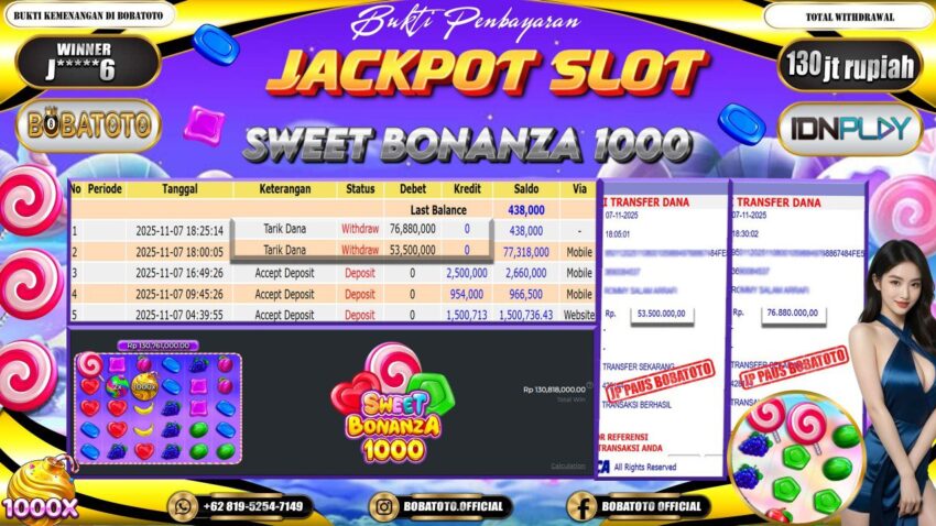 BOBATOTO – Selamat kepada User id : J*****6 Telah berhasil mendapatkan kemenangan besar pada permainan SLOT SWEET BONANZA 1000 Dengan kemenangan Sebesar Rp.130,000,000,-. Setelah mengisi formulir withdraw dengan kurung waktu hanya 5 – 10 menit pihak bobatoto sudah melakukan transfer kepada pemilik Userid dan dana sudah dapat di cairkan oleh pemenang. Bukti pembayaran yang kami berikan merupakan bukti pembayaran yang SAH / VALID yang langung di dapatkan melaui tanda transfer transaksi dari Bank yang di tuju.