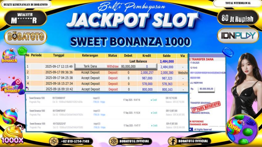 BOBATOTO – Selamat kepada User id : M******R Telah berhasil mendapatkan kemenangan besar pada permainan  SLOT SWEET BONANZA 1000  Dengan kemenangan Sebesar Rp.80,000,000,-. Setelah mengisi formulir withdraw dengan kurung waktu hanya 5 – 10 menit pihak bobatoto sudah melakukan transfer kepada pemilik Userid dan dana sudah dapat di cairkan oleh pemenang. Bukti pembayaran yang kami berikan merupakan bukti pembayaran yang SAH / VALID yang langung di dapatkan melaui tanda transfer transaksi dari Bank yang di tuju.