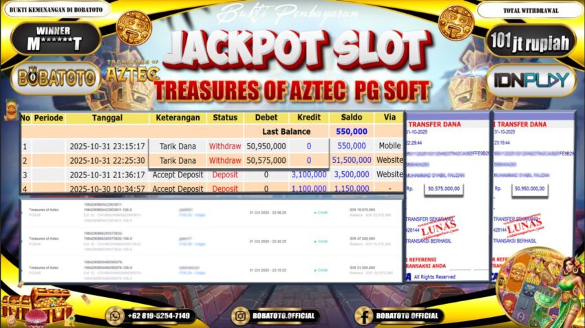 BOBATOTO – Selamat kepada User id : M*****T Telah berhasil mendapatkan kemenangan besar pada permainan  SLOT TREASURES OF AZTEC  Dengan kemenangan Sebesar Rp.101,000,000,-. Setelah mengisi formulir withdraw dengan kurung waktu hanya 5 – 10 menit pihak bobatoto sudah melakukan transfer kepada pemilik Userid dan dana sudah dapat di cairkan oleh pemenang. Bukti pembayaran yang kami berikan merupakan bukti pembayaran yang SAH / VALID yang langung di dapatkan melaui tanda transfer transaksi dari Bank yang di tuju.