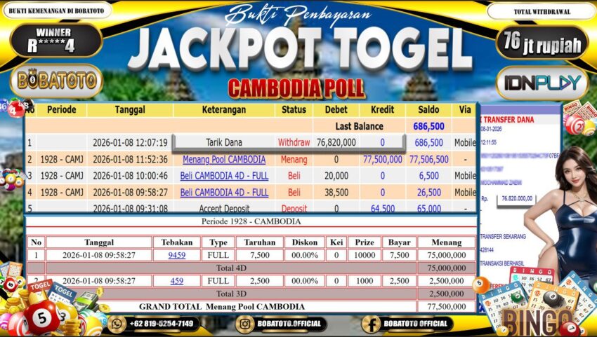 BOBATOTO – Selamat kepada User id : R*****4 Telah berhasil mendapatkan kemenangan besar pada permainan TOGEL CAMBODIA Dengan kemenangan Sebesar Rp.76,000,000,-. Setelah mengisi formulir withdraw dengan kurung waktu hanya 5 – 10 menit pihak bobatoto sudah melakukan transfer kepada pemilik Userid dan dana sudah dapat di cairkan oleh pemenang. Bukti pembayaran yang kami berikan merupakan bukti pembayaran yang SAH / VALID yang langung di dapatkan melaui tanda transfer transaksi dari Bank yang di tuju.