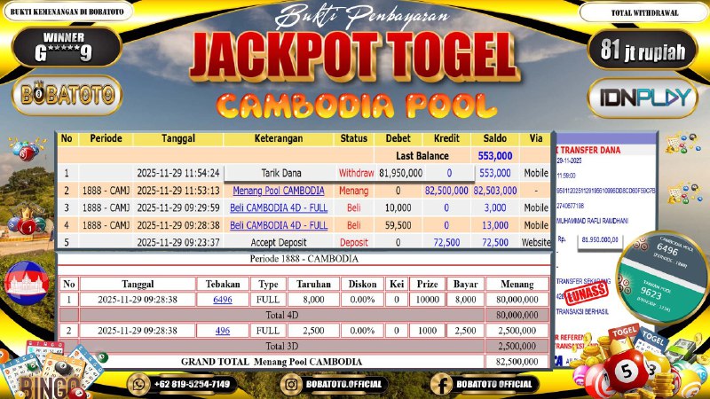 BOBATOTO – Selamat kepada User id : G*****9 Telah berhasil mendapatkan kemenangan besar pada permainan TOGEL CAMBODIA Dengan kemenangan Sebesar Rp.81,000,000,-. Setelah mengisi formulir withdraw dengan kurung waktu hanya 5 – 10 menit pihak bobatoto sudah melakukan transfer kepada pemilik Userid dan dana sudah dapat di cairkan oleh pemenang. Bukti pembayaran yang kami berikan merupakan bukti pembayaran yang SAH / VALID yang langung di dapatkan melaui tanda transfer transaksi dari Bank yang di tuju.