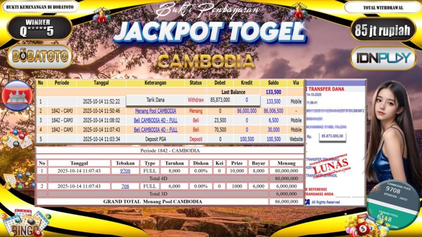 BOBATOTO – Selamat kepada User id : Q*****5 Telah berhasil mendapatkan kemenangan besar pada permainan TOGEL CAMBODIA Dengan kemenangan Sebesar Rp.85,000,000,-. Setelah mengisi formulir withdraw dengan kurung waktu hanya 5 – 10 menit pihak bobatoto sudah melakukan transfer kepada pemilik Userid dan dana sudah dapat di cairkan oleh pemenang. Bukti pembayaran yang kami berikan merupakan bukti pembayaran yang SAH / VALID yang langung di dapatkan melaui tanda transfer transaksi dari Bank yang di tuju.