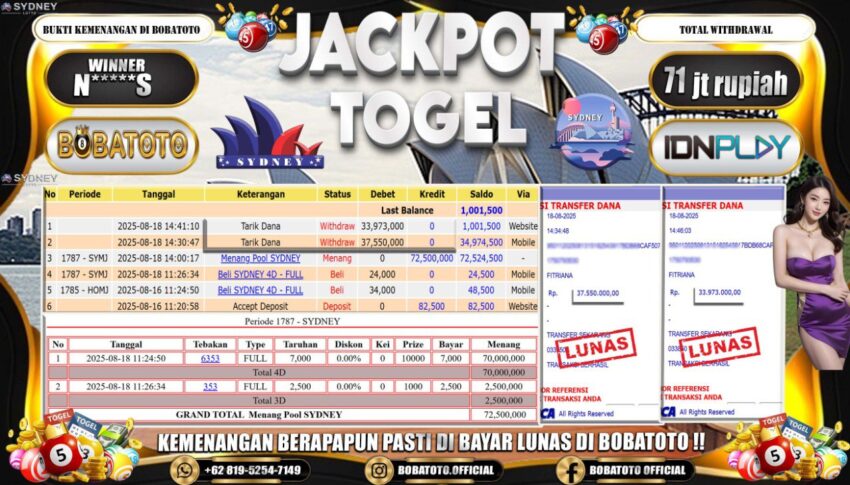 BOBATOTO – Selamat kepada User id : N*****S Telah berhasil mendapatkan kemenangan besar pada permainan TOGEL SYDNEY LOTTO Dengan kemenangan Sebesar Rp.71,000,000,-. Setelah mengisi formulir withdraw dengan kurung waktu hanya 5 – 10 menit pihak bobatoto sudah melakukan transfer kepada pemilik Userid dan dana sudah dapat di cairkan oleh pemenang. Bukti pembayaran yang kami berikan merupakan bukti pembayaran yang SAH / VALID yang langung di dapatkan melaui tanda transfer transaksi dari Bank yang di tuju.