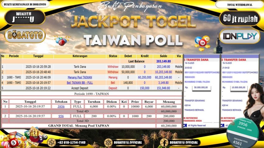 BOBATOTO – Selamat kepada User id : J******U Telah berhasil mendapatkan kemenangan besar pada permainan TOGEL TAIWAN Dengan kemenangan Sebesar Rp.60,000,000,-. Setelah mengisi formulir withdraw dengan kurung waktu hanya 5 – 10 menit pihak bobatoto sudah melakukan transfer kepada pemilik Userid dan dana sudah dapat di cairkan oleh pemenang. Bukti pembayaran yang kami berikan merupakan bukti pembayaran yang SAH / VALID yang langung di dapatkan melaui tanda transfer transaksi dari Bank yang di tuju.